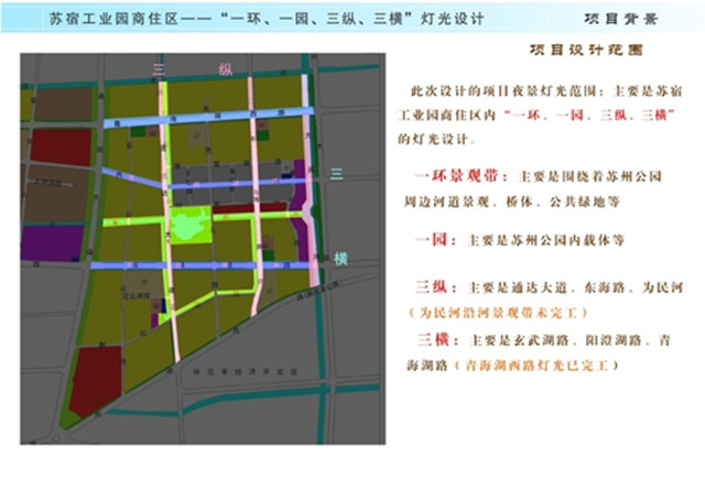 本次商住區(qū)亮化提升工程圍繞“一環(huán)、一園、三縱、三橫”進行重點打造,燈光設(shè)計以“綠色的、生態(tài)的”為定位,不但要展示宿遷的城市特質(zhì),提升市民的自豪感和安全感,鼓勵周邊市民夜間步行,還將以現(xiàn)代科技之光區(qū)展現(xiàn)蘇宿園區(qū)騰飛的城市變遷。