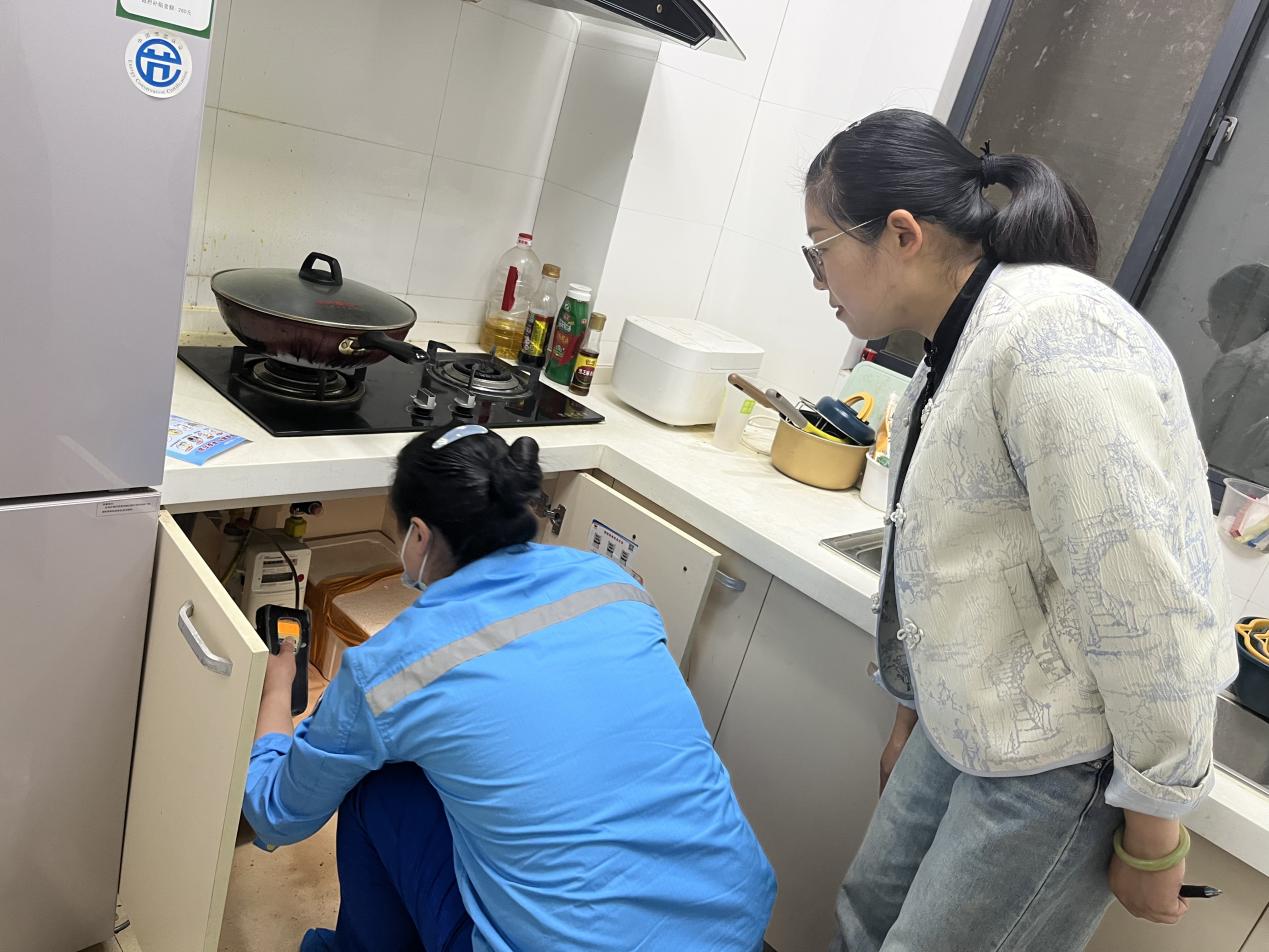 工作人員對燃?xì)庥脩糸_展逐戶檢查,重點對天然氣接口軟管是否老化、燃?xì)馄骶呤欠癯谑褂?、是否有熄火保護(hù)措施,燃?xì)忾y門是否正常使用等問題進(jìn)行全面檢查。在檢查過程中,發(fā)現(xiàn)廚房操作間積堆物品、線路交叉重疊等現(xiàn)象,要求客戶立即整改。