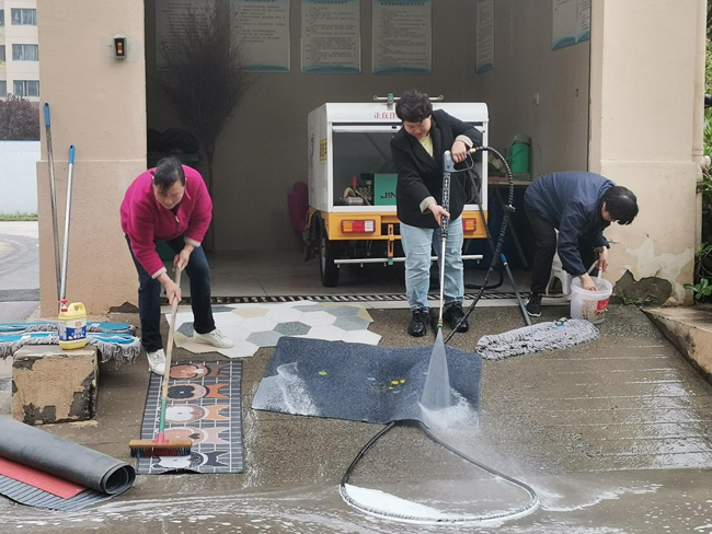 工作人員幫業(yè)主們清洗著臟臟的地毯,用高壓水槍耐心、仔細(xì)沖洗著地毯的正反面,小舉動,大關(guān)懷,每一次蹲下與起身,帶來的都是地墊的嶄新如初。
