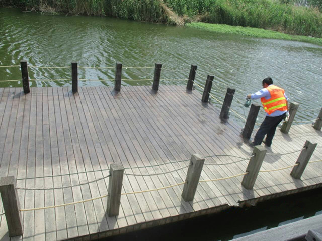 維保工作首先從為民河公園開(kāi)始。為民河公園于2012年12月竣工投入使用,為園區(qū)最早建成的景觀(guān)公園之一。公園內(nèi)有賈拉木棧道約570平方米,硬木扶手、欄桿約402米。隨著使用年限增加,公園部分設(shè)施特別是木棧道、親水平臺(tái)等逐漸發(fā)生了老化,木材表面出現(xiàn)不同程度的褪色和裂紋,影響了親水平臺(tái)的景觀(guān)效果。為此,公司先安排維保人員對(duì)破損處進(jìn)行維修,然后清掃干凈噴漆,待自然晾干后再開(kāi)放通行,給親水平臺(tái)穿上了新“嫁衣”。
