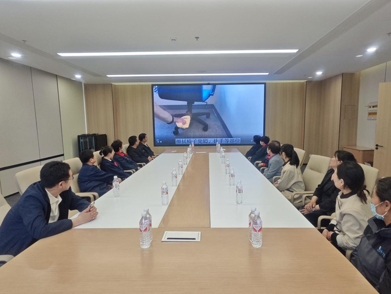 培訓圍繞辦公大樓地面清掃、電梯轎廂清潔保養(yǎng)、玻璃幕墻清洗維護、會議室、茶水間及衛(wèi)生間細節(jié)處理到外圍路面和綠化區(qū)域的日常清理管養(yǎng)等內(nèi)容,通過觀看視頻和現(xiàn)場演示方式,詳細講解了操作規(guī)范和作業(yè)標準,確保保潔人員能夠熟練掌握高效、科學的清潔技巧,提高工作質(zhì)量與效率。